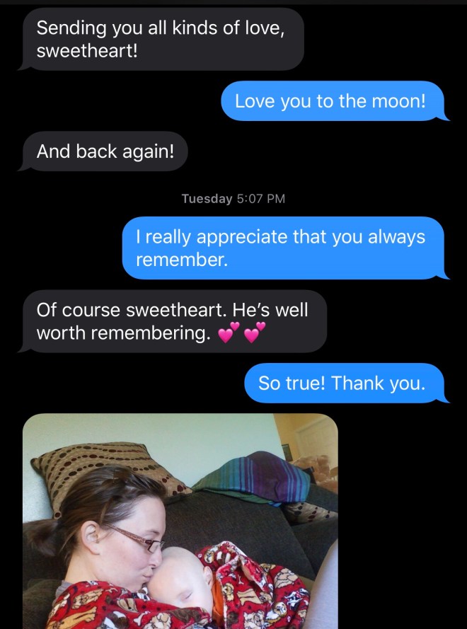 On Tuesday, Courtney and I received messages and phone calls from friends who were thinking of us and Josh. It means so much to us that people remember our handsome man. One friend and I exchanged these messages: