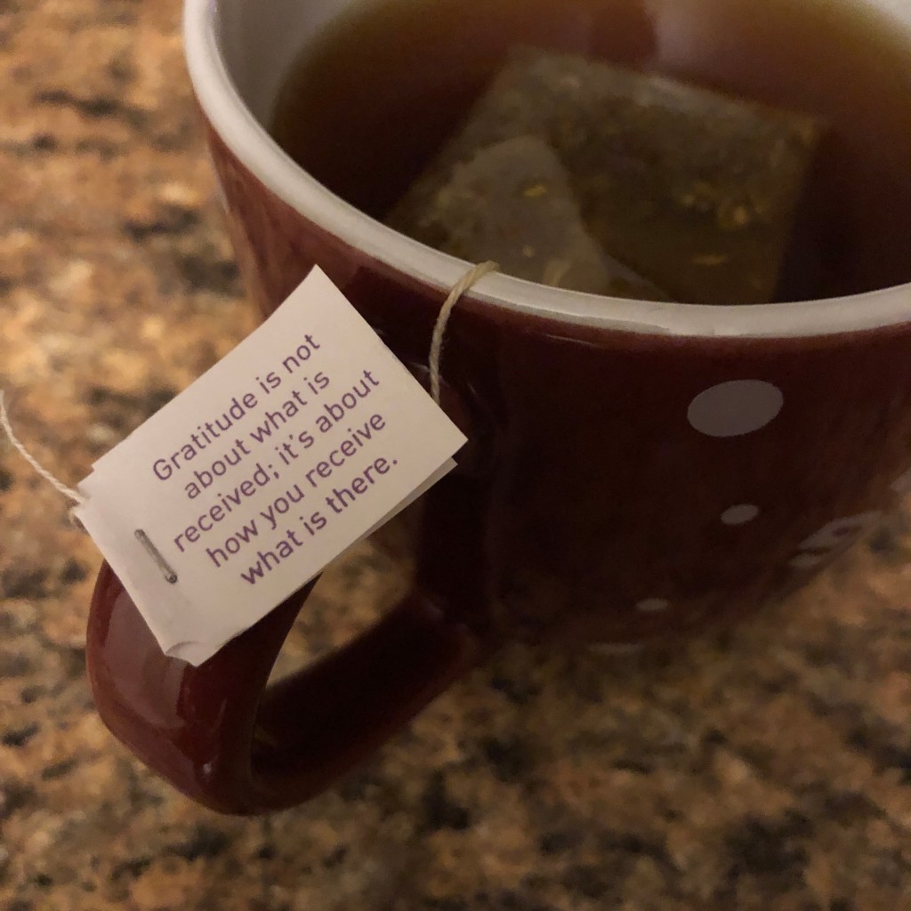 I am grateful for the moments and the memories. I find myself both joyful for current moments and am stricken with sadness for moments left unmade. Yet, perhaps I am more aware as I know how quickly these joyful moments can pass. A coworker recently shared she lost a daughter six years ago. She said it has made her cherish the moments and the relationships she is able to have. She is a fiercely strong woman, both as she grieves and as she heals. Our relationships are our legacy. As the quote on my tea bag reminds me “Gratitude is not about what is received; it is about how you receive what is there.” I am working on being there – being here- present in my moments both of struggle and of strength.