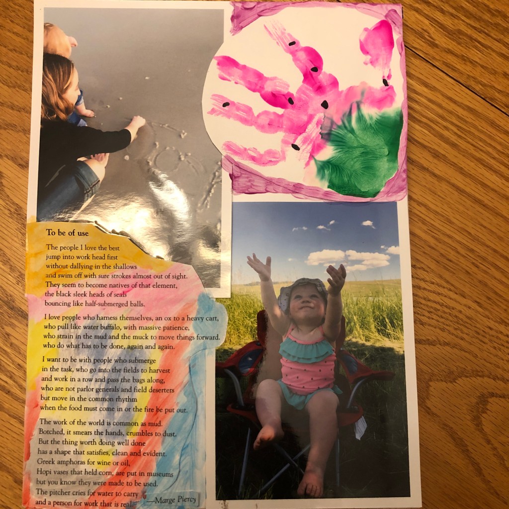 To help keep me focused on the positives, I have started a gratitude journal. My sister, Emily, is my accountability partner. Each day we share three things from our day for which we are grateful. I covered my journal with photos that bring me joy: Emma’s handprint, her first trip to the ocean as we traced Josh’s name in the sand, a camping trip, and Marge Pierce’s poem “To be of Use.”